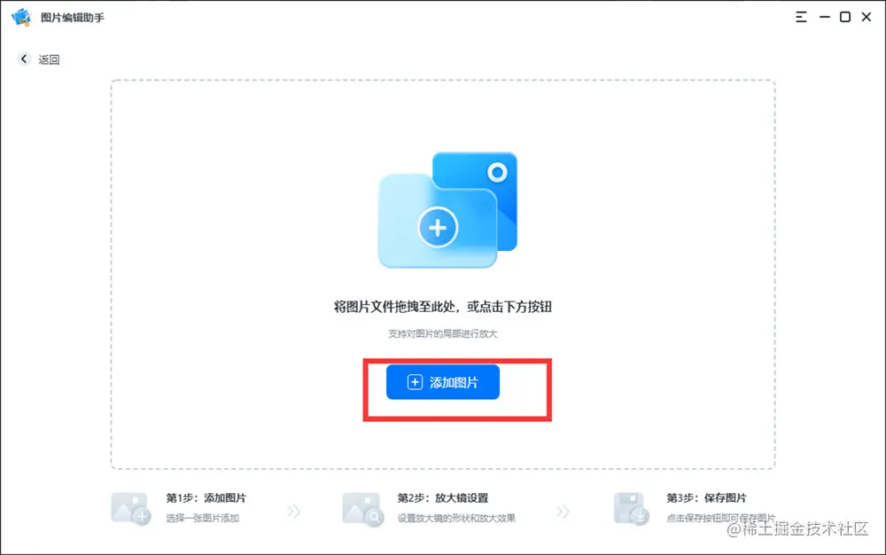 这是一款手机上的修图软件,进入到软件的首页之后,直接上传需要放大的图片,同时点击 【添加图片】 选项,再添加一张同样的图片文件。点击 【形状】 选择一个好看的形状框选需要放大的区域,并且调整边框即可。