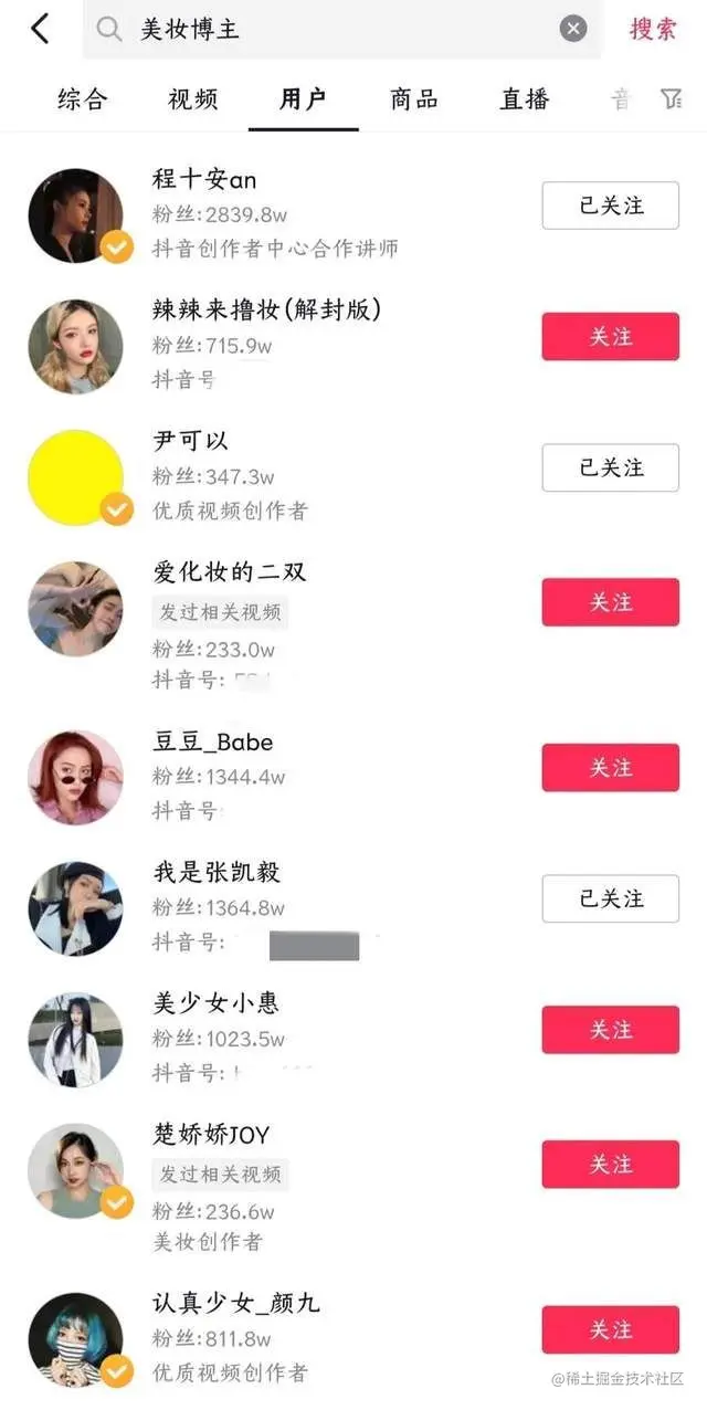 比如想要做美妆类账号就可以搜索美妆,结果页面会出现一系列美妆博主账号推荐。在列表中找到适合我们风格定位的账号进行分析。选择的时候,要看对标账号的粉丝量,播放量,以及整个账号主页的风格定位。找到3-5个然后再具体分析每一个对标账号。