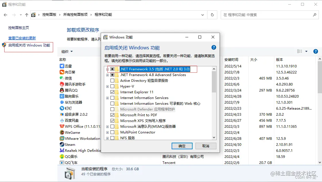 点击启用用或关闭Windows功能勾选NET3.5点击确定