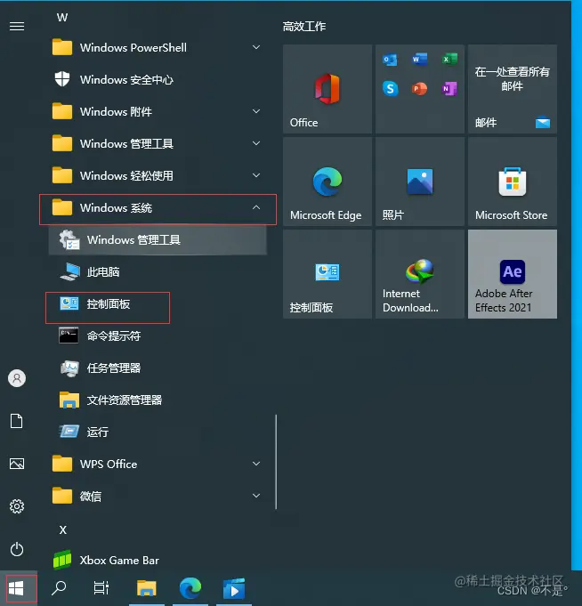 点击开始往下滑找到Windows系统点击找到控制面板打开