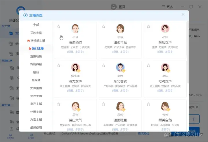 提供的主播包括:感情主播、直播场景、女生主播、男生主播、外语主播、方言主播等,每个大的声音分类下面还为大家详细分类了不同场景会用到的声音风格,选择好主播后它还会对多音字自动进行识别纠正。