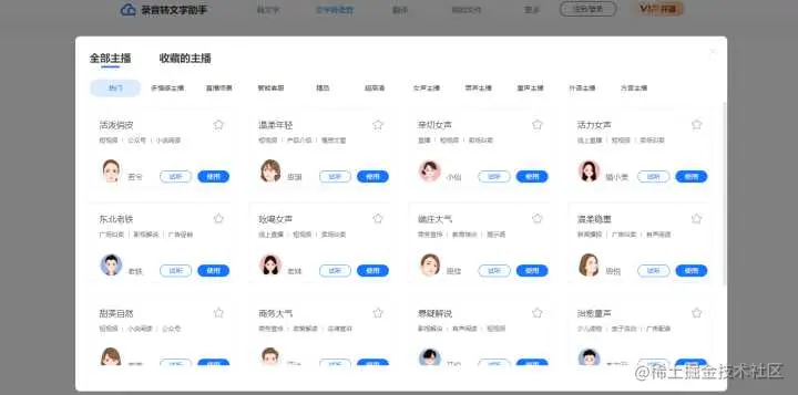 选择在线合成,下面会看到文字输入框,输入需要转写的文字内容,然后可以在页面的右侧看到不同风格的主播声音,包括各种、活泼俏皮声音、短视频配音、线上直播、广场叫卖、影视解说、小说阅读等各种声音都有,甚至还有外语主播、方言主播等。