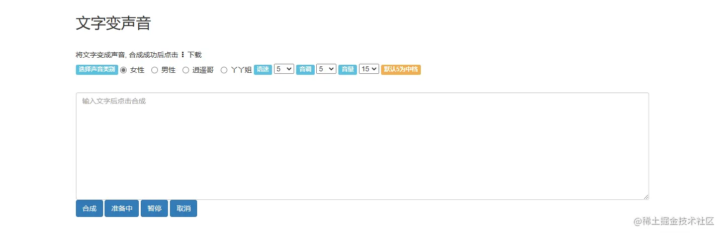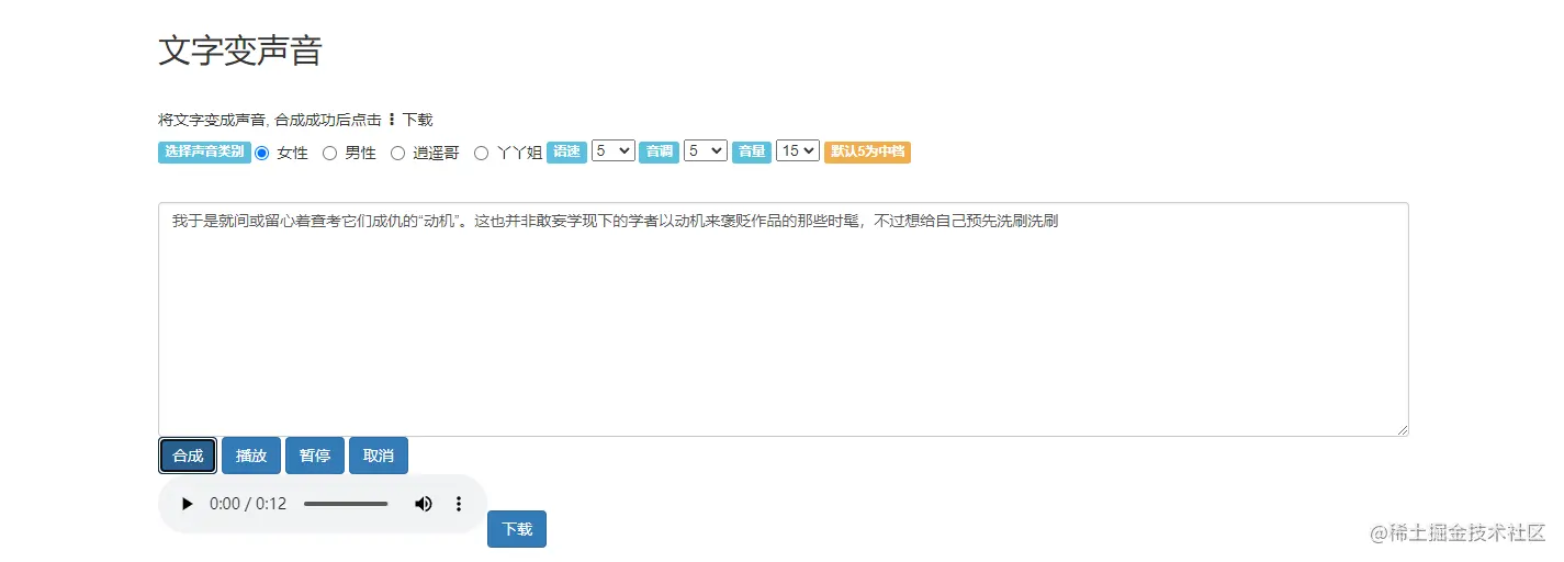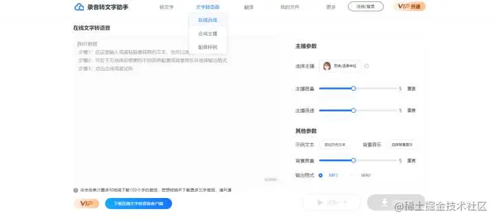 输入或粘贴提前复制的文字内容,然后在上方选择转写的声音类别,以及调整声音快慢、大小,完成后点击下方的合成,很快就可以在页面看到一个音频文件,支持直接点击播放音频试听。