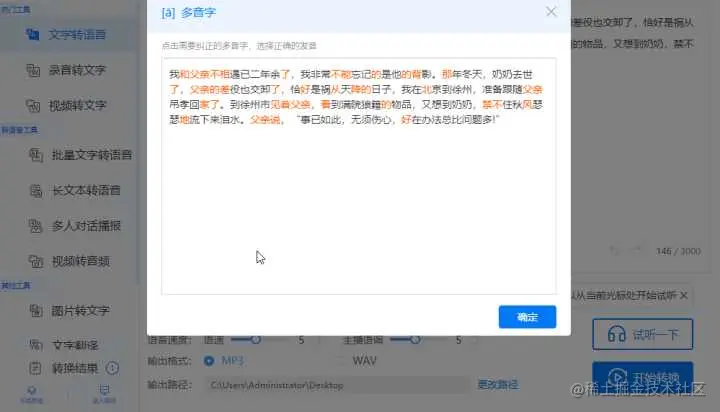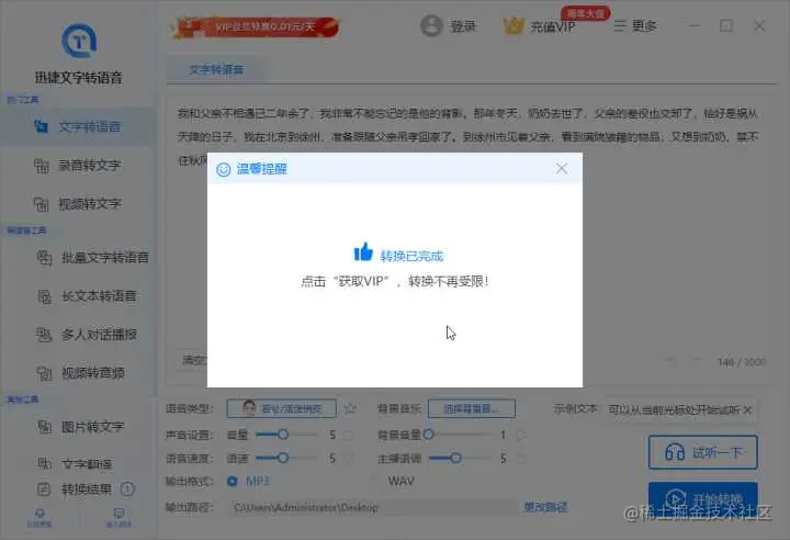 最后点击开始转写,很快就可以看到转写成功的文件,转写后的文件会直接保存到转换结果,支持在线试听以及保存到桌面,下载的音频文件可以直接进行使用。