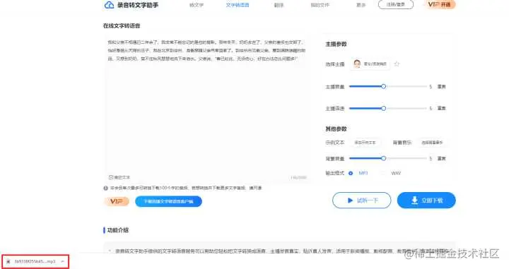 选择的主播还支持在线试听效果,觉得不错的话点击使用,然后选择主播播放音量、语速、以及背景音量、输出格式,选择完成后点击开始转写,很快就可以看到转写成功的音频文件,完成的音频文件可以直接点击下载。