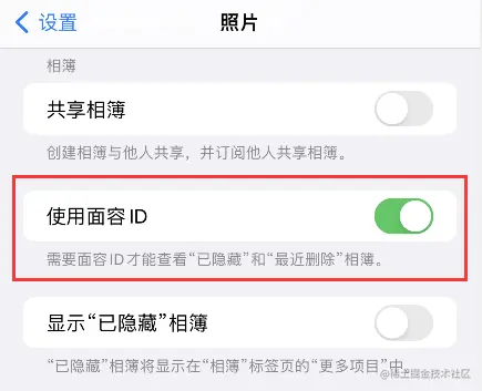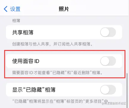 3、在苹果iPhone手机照片内,找到使用面容ID,并点击后面的开启。即可实现需要面容ID才能查看已隐藏和最近删除相薄。