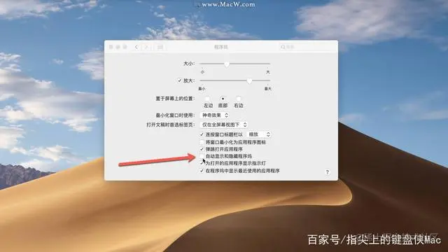 中,设置Dock大小、位置、效果和自动显示和隐藏,特别是自动显示和隐藏,隐藏Dock 可以增大屏幕可利用面积,当光标移动到屏幕下方时会自动显示,不影响使用。