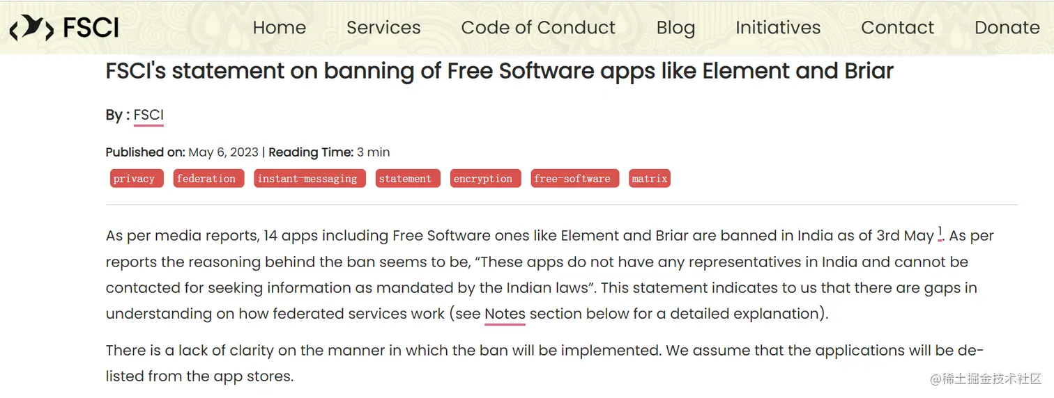 印度政府以国家安全为由禁止了 14 种消息应用程序,其中包括一些开源软件。被封锁的应用程序有 Wickrme、Mediafire、Briar、BChat、Nandbox、Conion、IMO、Element、Second line、Zangi、Threema、Crypviser、Enigma 和 Safeswiss。