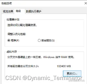 虚拟内存设置方法 一眉师傅 2023-05-10 237 阅读1分钟 “此电脑”->右键->选择“属性” 点击左侧“高级系统设置” 系统属性面板->选择“高级”面板->“性能”->“设置” 选择“高级”面板->“虚拟内存”->“更改” “自动管理所有驱动器的分页文件大小”取消选中->“每个驱动器的分页文件大小”中选择非系统盘盘符->勾选“自定义大小”,将初始大小和最大值设置为想要申请内存的大小->点击“确定”,重启系统即可生效