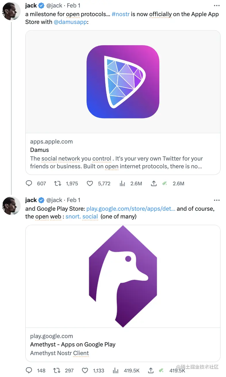 2月1日,Twitter 联合创始人 Jack Dorsey 发布推文表示,基于分布式社交媒体协议 Nostr 的社交产品 Damus 和 Amethyst 正式在苹果 App Store 和谷歌 Google Play Store 上线。