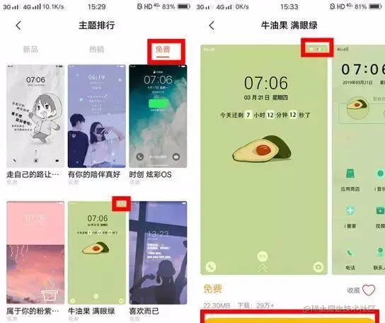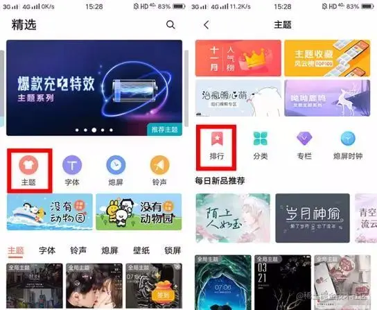 最后我们在这个主题分类里,找到右上角电量显示图标为彩虹色的主题,然后将它设为手机主题,即可把手机电量显示变为彩虹色了。