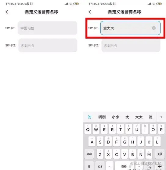 进入该功能之后,我们可以随便选择一张SIM卡修改名称。你可以将这个名称改为自己名字,当然其他文字也是可以的,但是不宜过长。设置完成之后,我们就能看到状态栏原本显示运营商名称的位置,显示的是我们的名字。