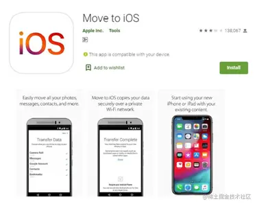 在开始操作之前,请在您的Android手机上安装应用程序——【转移到iOS】。打开安卓的WIFI网络,将苹果和安卓手机插入电源。