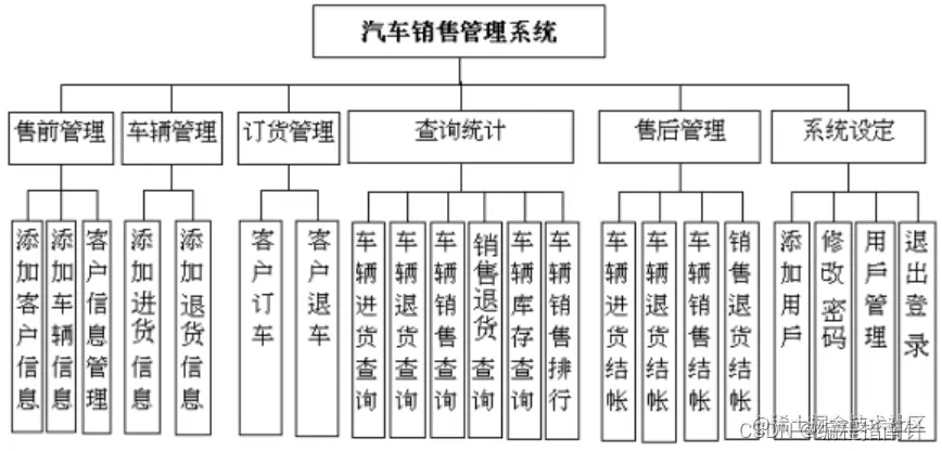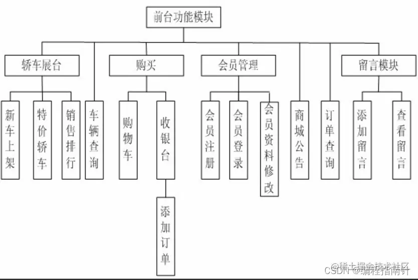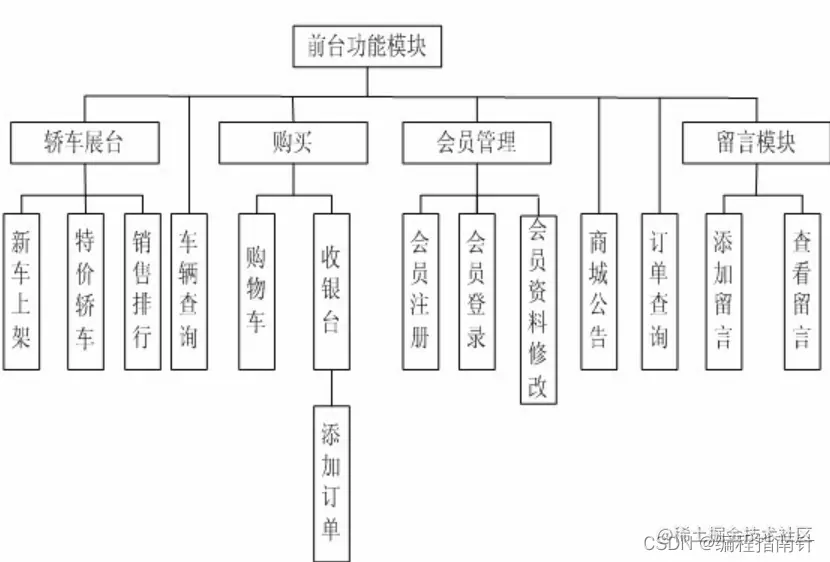 本项目存在两个个角色:用户和管理员,用户对应使用的是前台管理系统,而管理员对应使用后台管理系统。前台管理系统包括顾客个人信息管理、汽车展示、个人订单管理模块,购物车管理、汽车购物支付模块、汽车评论模块等,后台管理系统包括汽车评论管理模块、用户管理模块、汽车信息、种类管理模块、、数据可视化和公告管理模块、所有订单信息管理模块等。其主要功能模块图如图1-1所示: