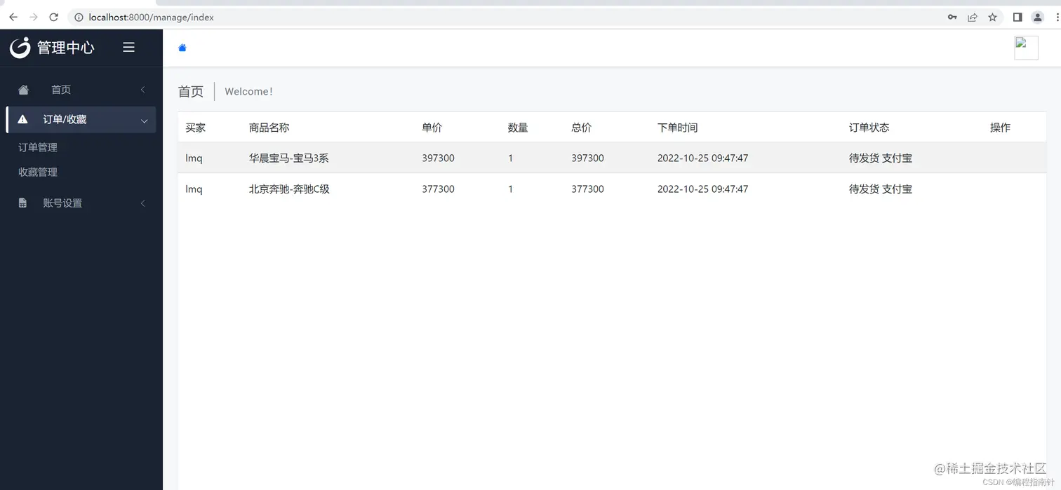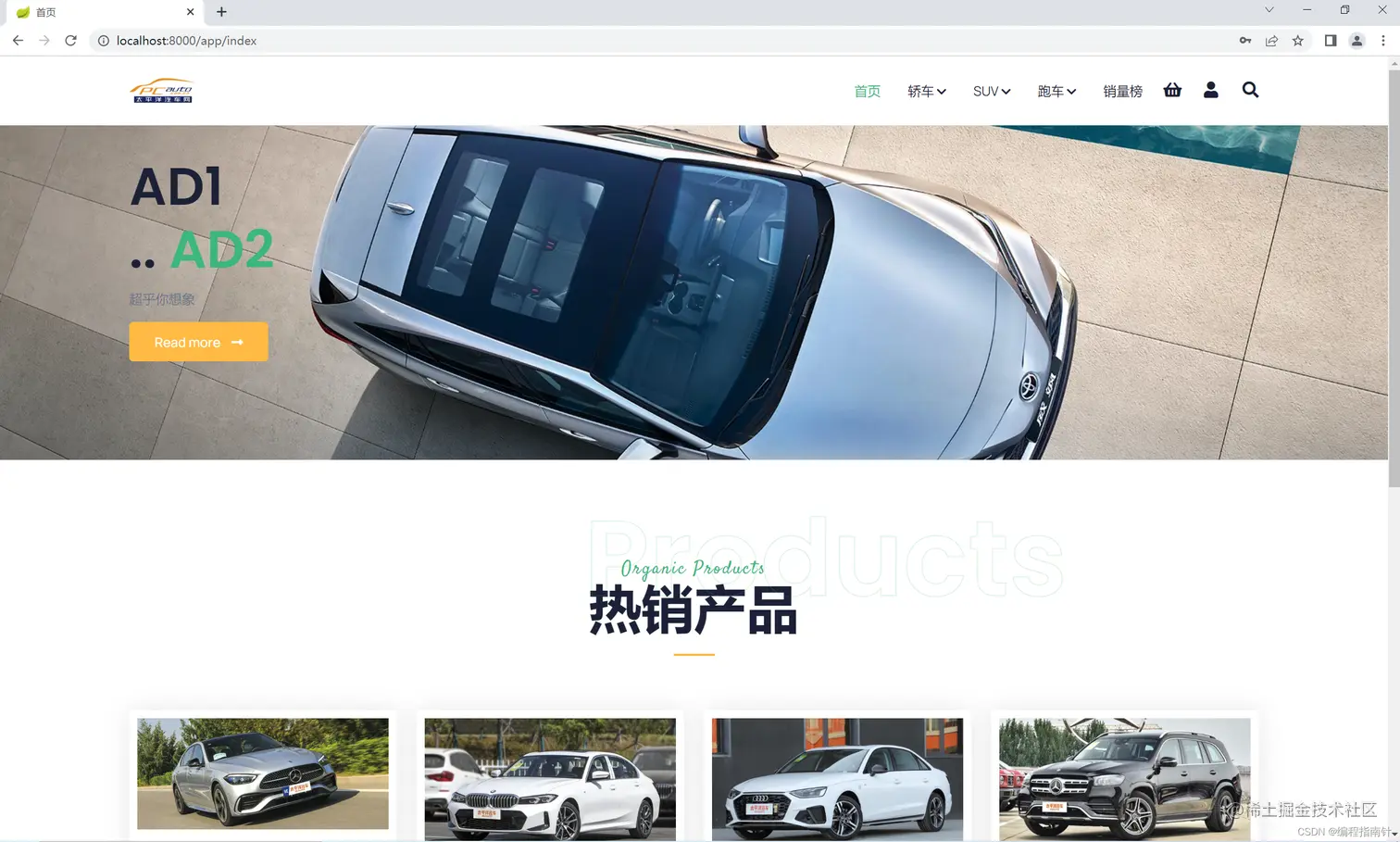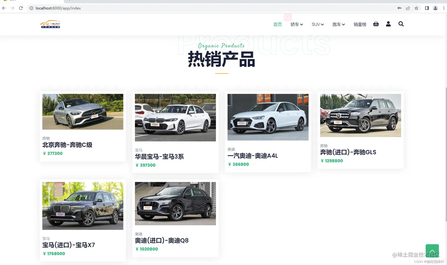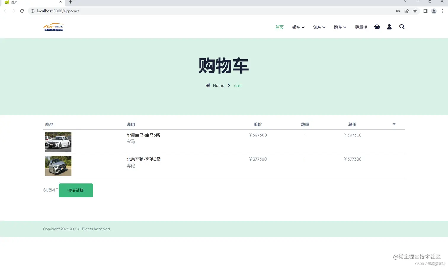 用户想要购买产品的时候,进入产品页面,选购自己想要的物品,将它加入购物车,进入到购物车页面的时候,用户根据自己想要购买的数量进行数量改变,确认购买后,用户点击购买,会自动跳转到支付页面,用户支付成功后页面会自动跳转到订单详情页面,供用户方便快速查看自己的订单。汽车产品展示界面如图5-4所示,购物车界面如图5-5所示,沙箱支付界面如图5-6所示,订单展示界面如图5-7所示。