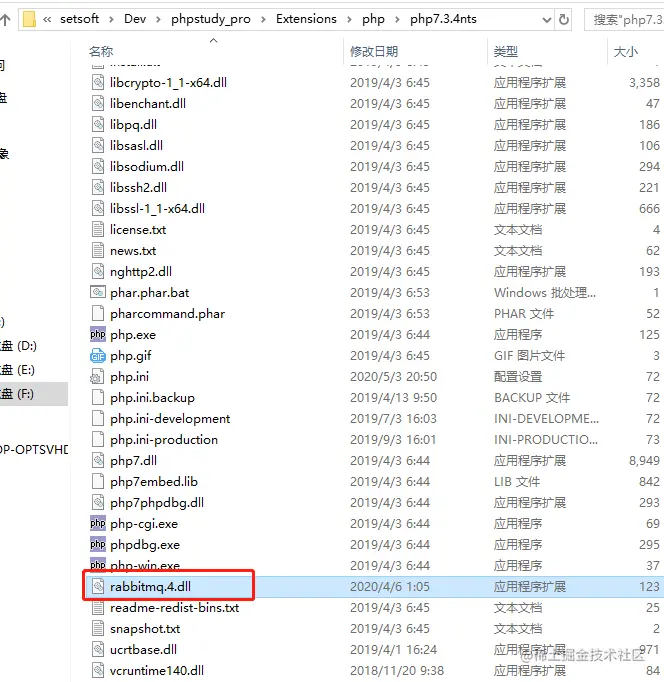 4. php_amqp.dll放在php的ext中,rabbitmq.4.dll放在PHP同级目录下。