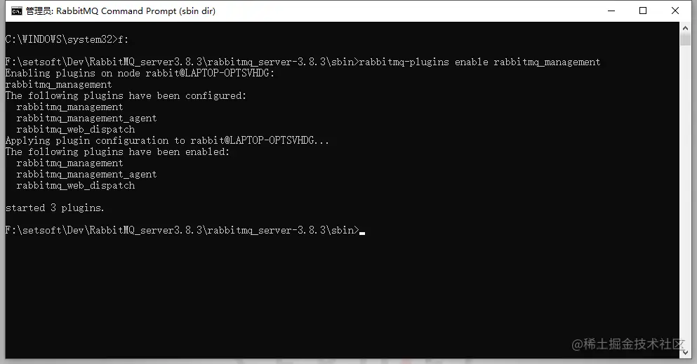 - 进入cmd面板,输入“rabbitmq-plugins enable rabbitmq_management”,启动插件。