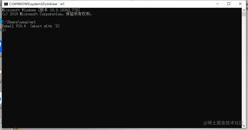- 查看是否安装成功,进入cmd,输入erl看到版本就可以。