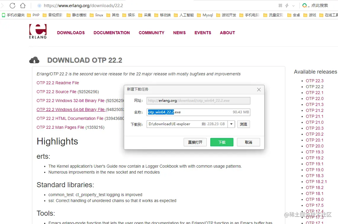 1.下载并安装Erlang,推荐版本otp_win64_22.2。