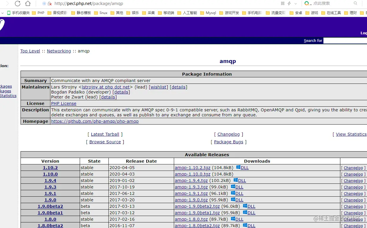 进入PHP扩展网站找到AMQP及与当前PHP对应版本的包下载。