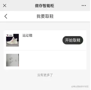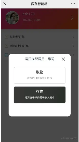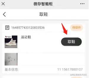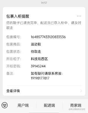 ④配送员存物后,系统自动生成取件码,用户会在公众号收到订单完成通知(用户需要关注该公众号),然后凭借取件码取走鞋子,或者扫码取走鞋子。如下图所示: