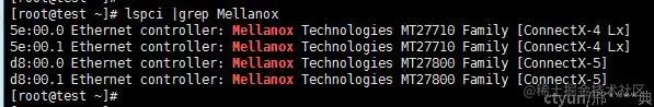 常用的IB网卡厂商有Mellanox,Intel。此处以Mellanox网卡实践,如下图所示test节点上有两块双端口Mellanox网卡,其中MT27800是100GE网卡,MT27710是25GE网卡,且已经工作在RoCE模式或TCP模式