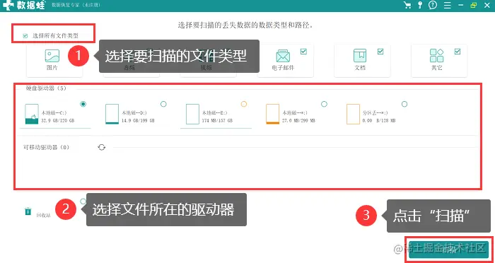 2.对需要扫描的文件类型进行选择(新用户建议全选,对磁盘做全面的扫描),同时对文件所在的驱动器进行选择(不确定可以多扫描几次),选择完毕点击 【扫描】 ;