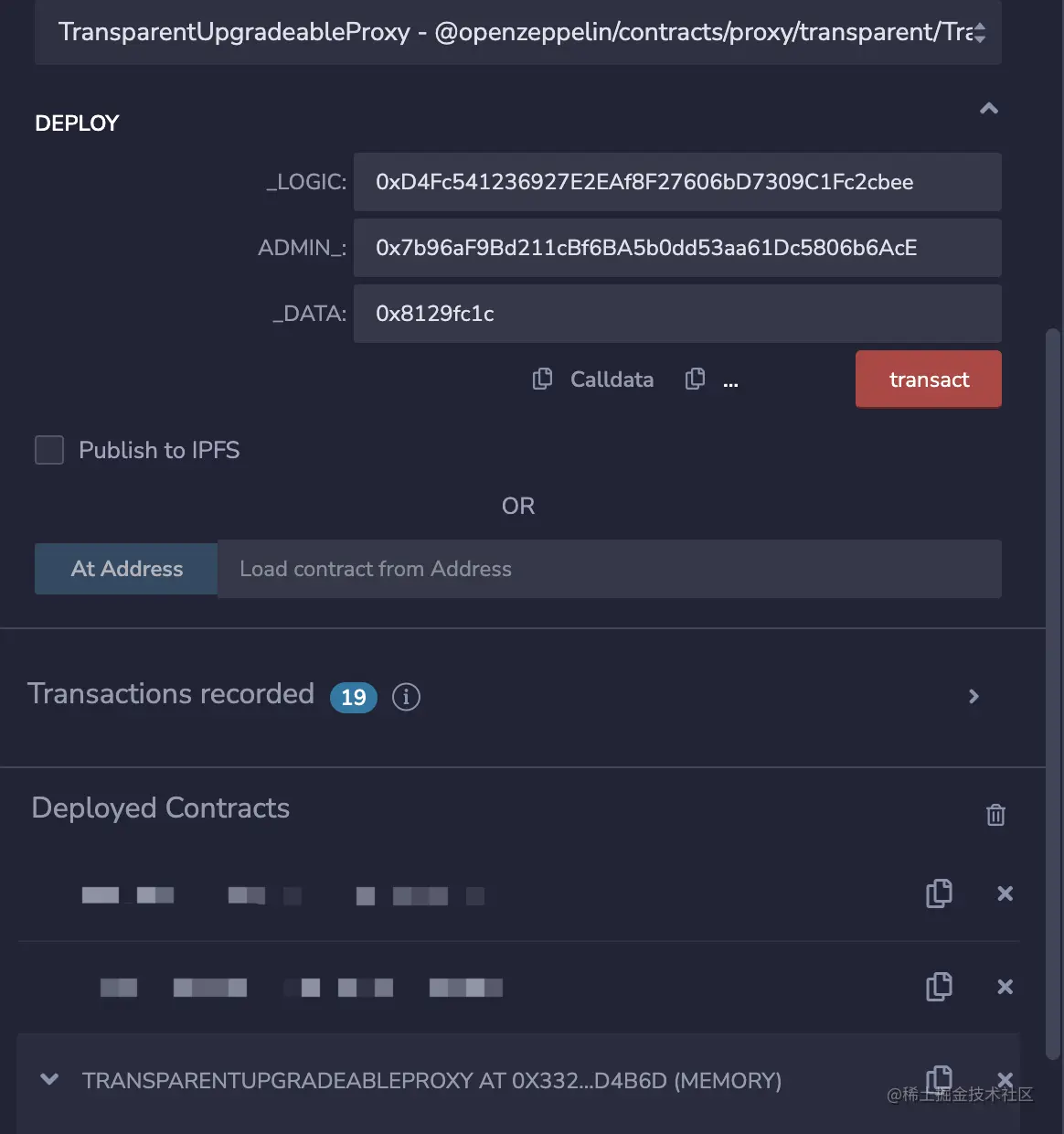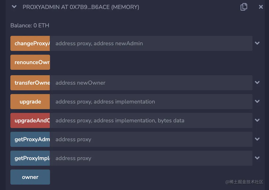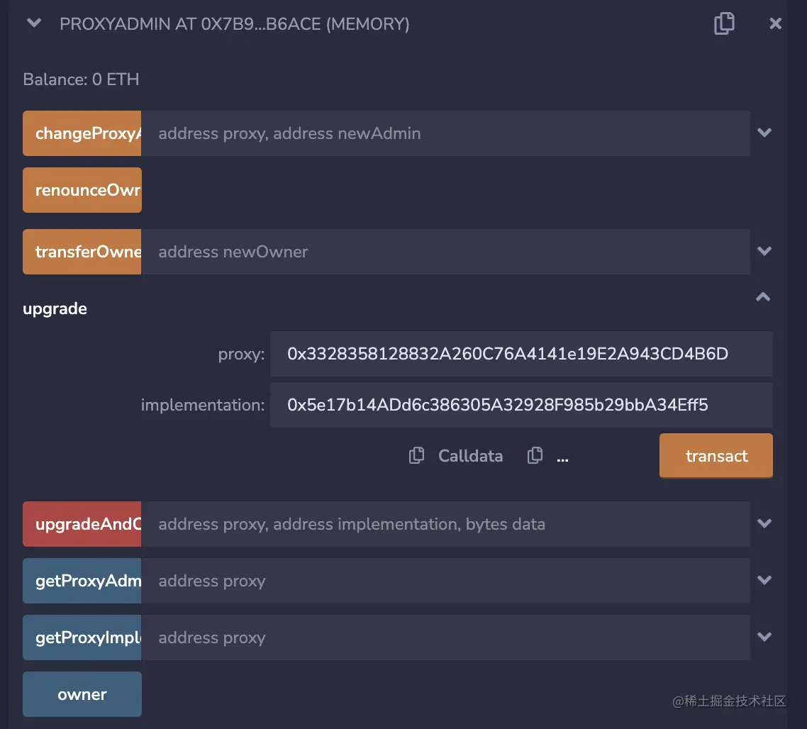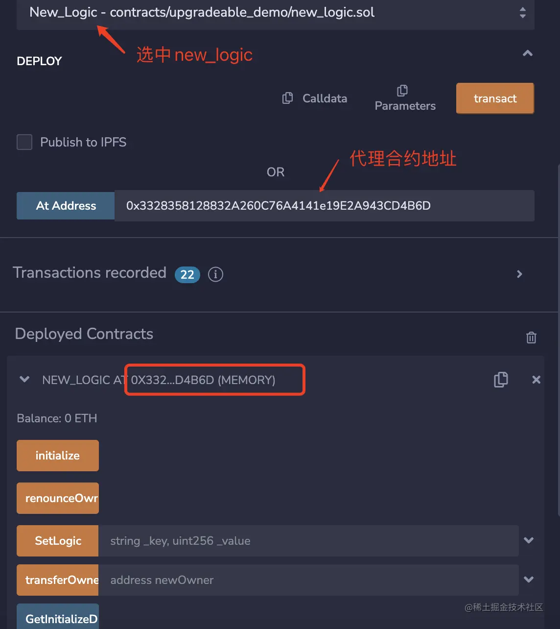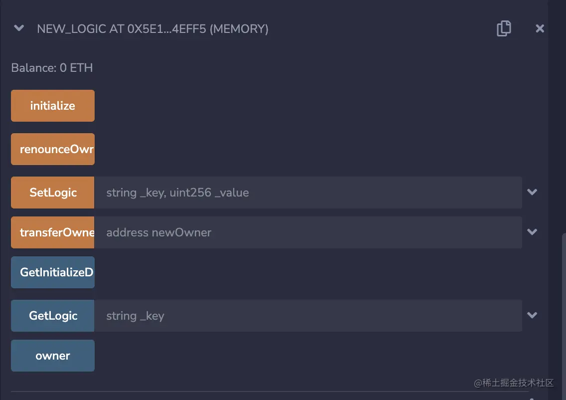 - 选中new_logic合约,at address传入代理合约的地址。之后我们就用这份合约地址的新合约进行操作。