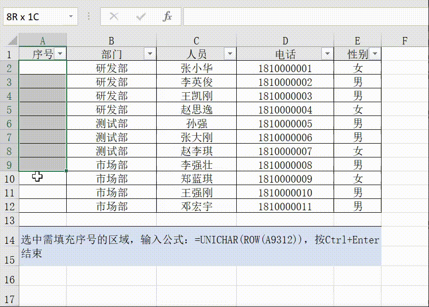 选中需填充序号的区域,输入公式:=UNICHAR(ROW(A9312)),按Ctrl+Enter结束