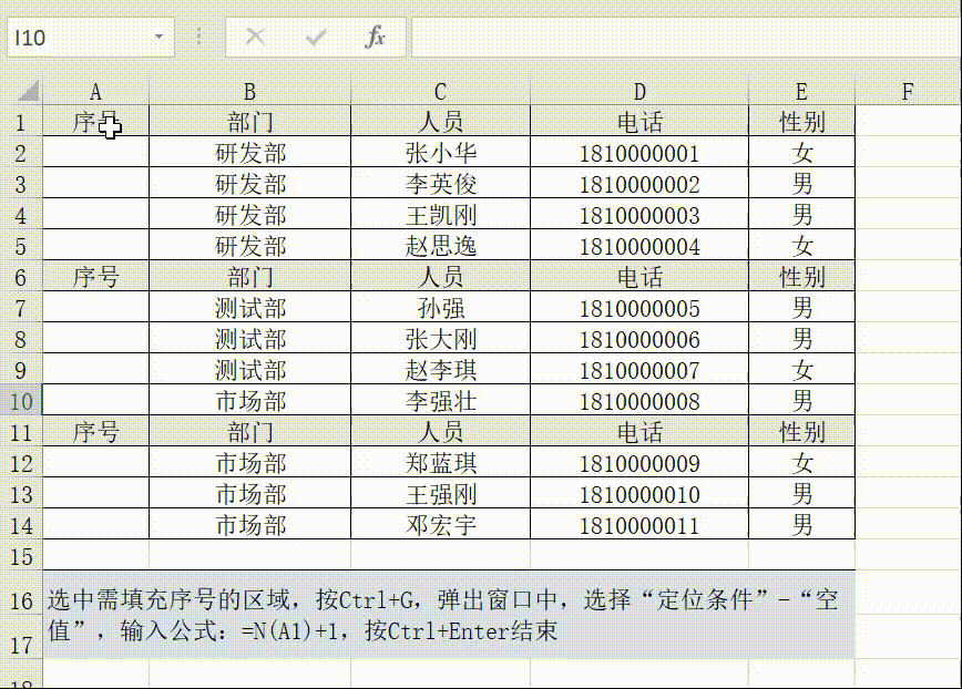 选中需填充序号的区域,按Ctrl+G,弹出窗口中,选择“定位条件”-“空值”,输入公式:=N(A1)+1,按Ctrl+Enter结束