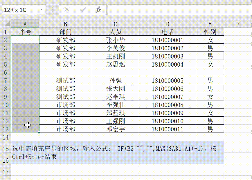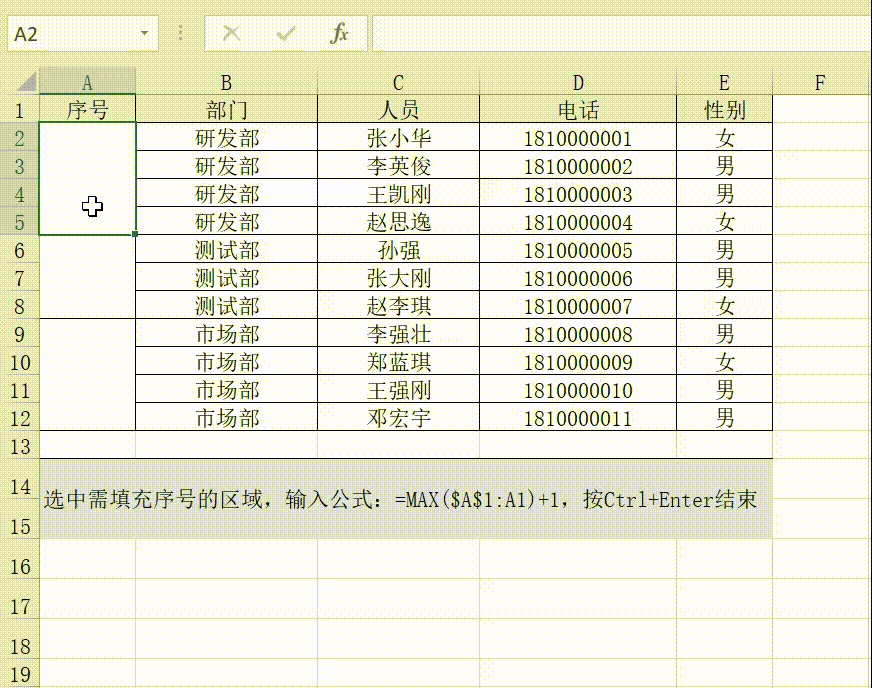 选中需填充序号的区域,输入公式:=MAX(1:A1)+1,按Ctrl+Enter结束