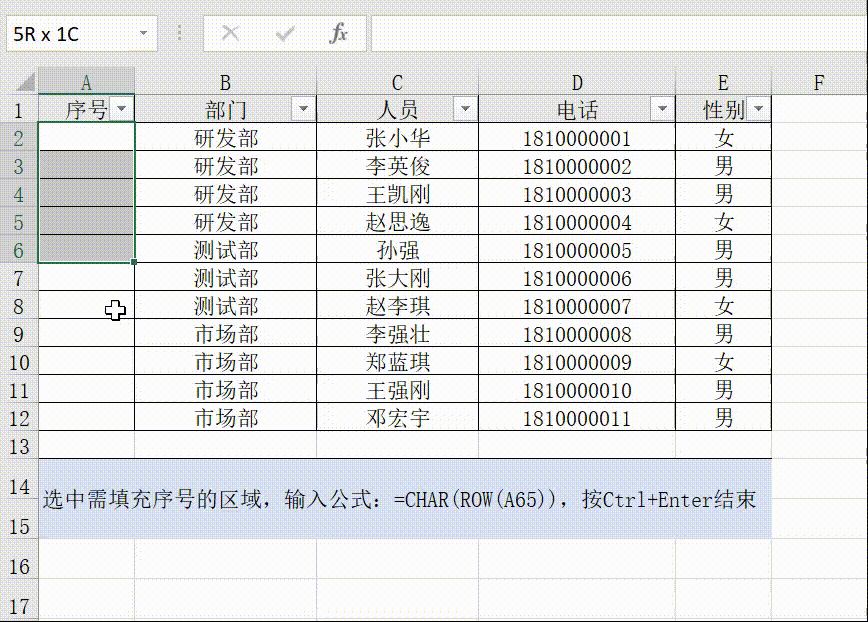 选中需填充序号的区域,输入公式:=CHAR(ROW(A65)),按Ctrl+Enter结束