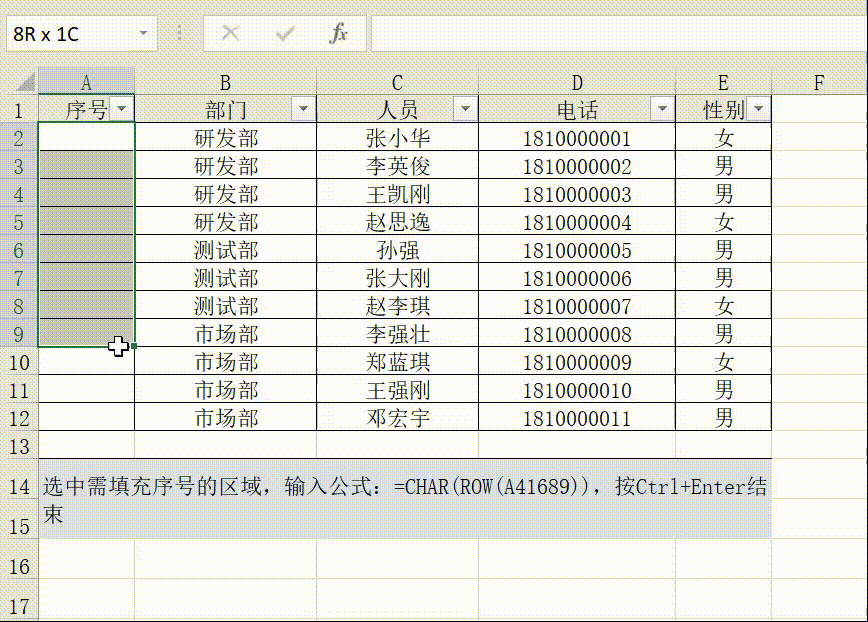 选中需填充序号的区域,输入公式:=CHAR(ROW(A41689)),按Ctrl+Enter结束