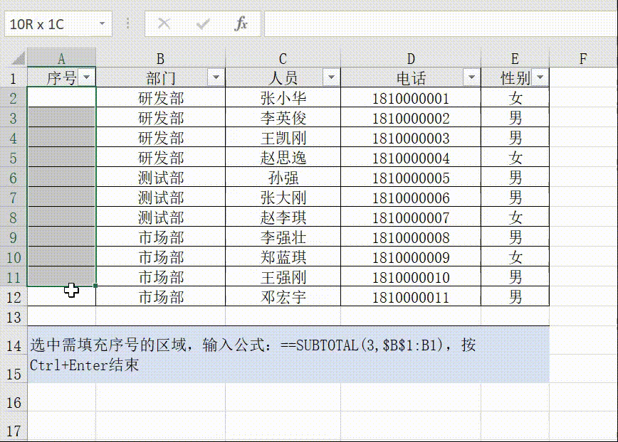 选中需填充序号的区域,输入公式:==SUBTOTAL(3,1:B1),按Ctrl+Enter结束