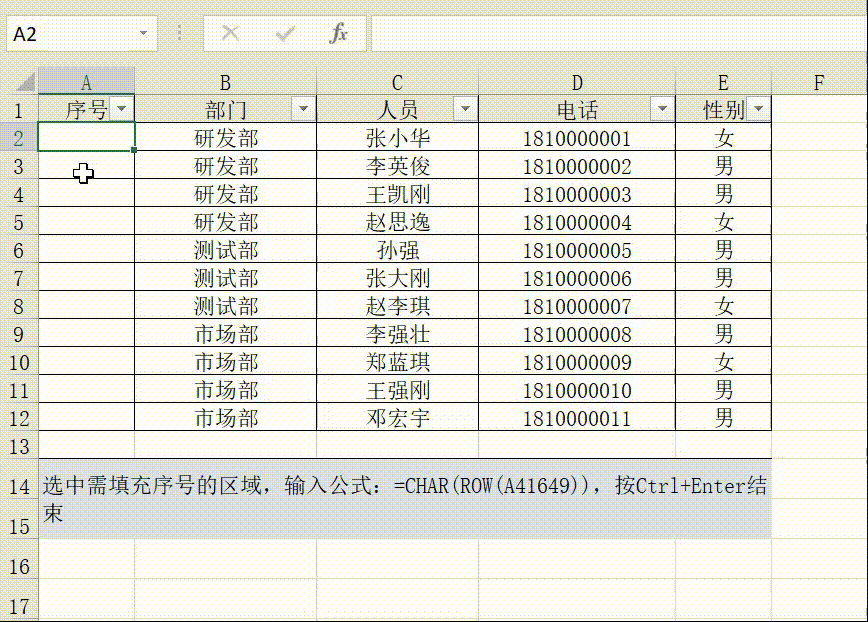 选中需填充序号的区域,输入公式:=CHAR(ROW(A41649)),按Ctrl+Enter结束