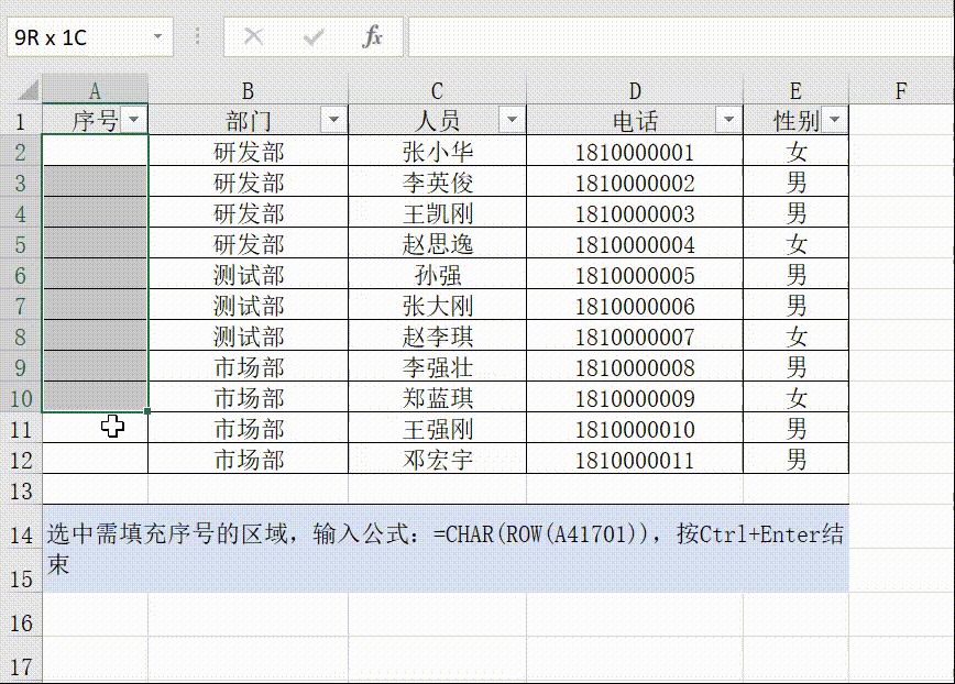 选中需填充序号的区域,输入公式:=CHAR(ROW(A41701)),按Ctrl+Enter结束