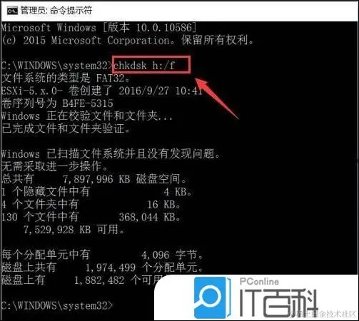 比如小编的问题U盘是H盘,所以修复这个H盘就需要输入:“chkdsk h:/f”这个命令。