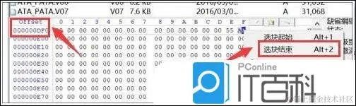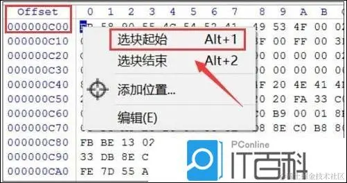 在offset找到0000 0C00一栏,用鼠标选中E,然后右键选择选块起始位置。