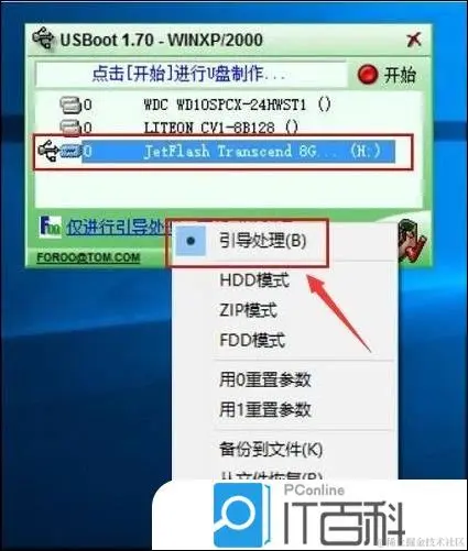 同样先在网上下载运行USBOOT程序,选择要修复的U盘及工作模式(引导处理),然后点击“开始”按钮即可。