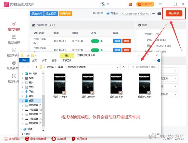 步骤3,点击工具右上角【开始转换】红色按键,启动视频格式转换,完成转换之后软件自动弹出输出文件夹,方便我们及时查看转换成的mp4视频。