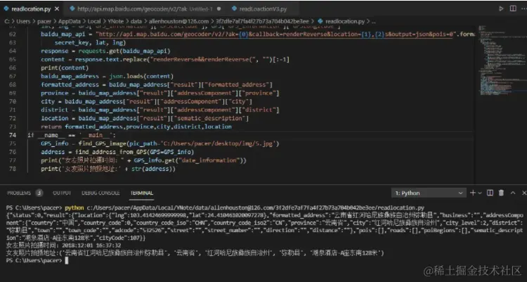 下面是通过exifread模块,来读取照片内的经纬度信息。