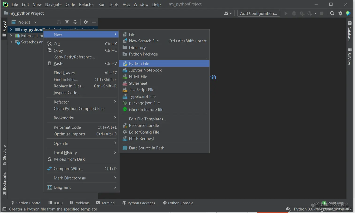 4创建. py 文件,选择项目点击 New-> Python File,然后输入文件名为 test