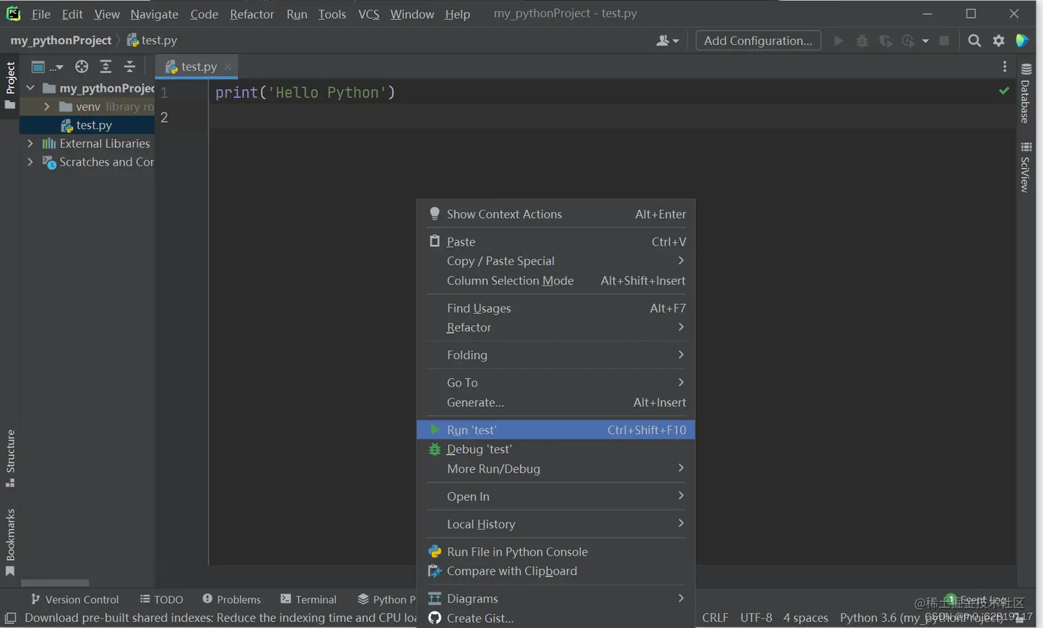 写入代码,右键选择Run‘test’