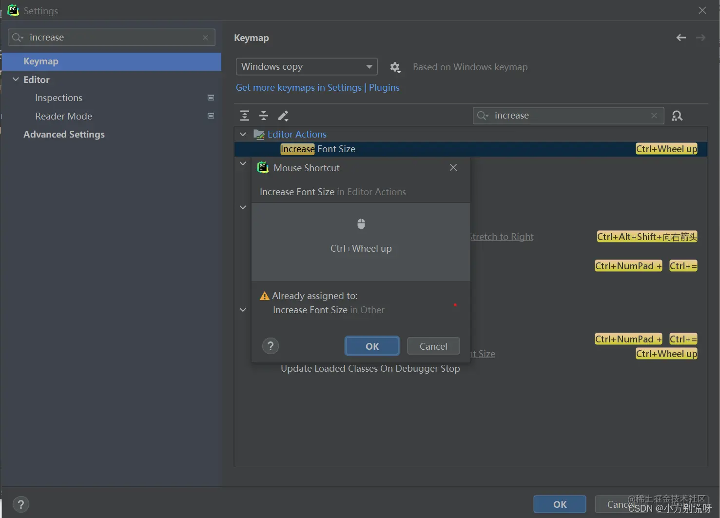 点击PyCharm界面左上角的File->Settings,在搜索栏中输入incresse回车,在右侧的Editor Action下对Increase Font Size单击,选中Add Mouse Shortcut设置Ctrl+滚轮向上实现增大字体。减小字体输入decrease 同理操作。