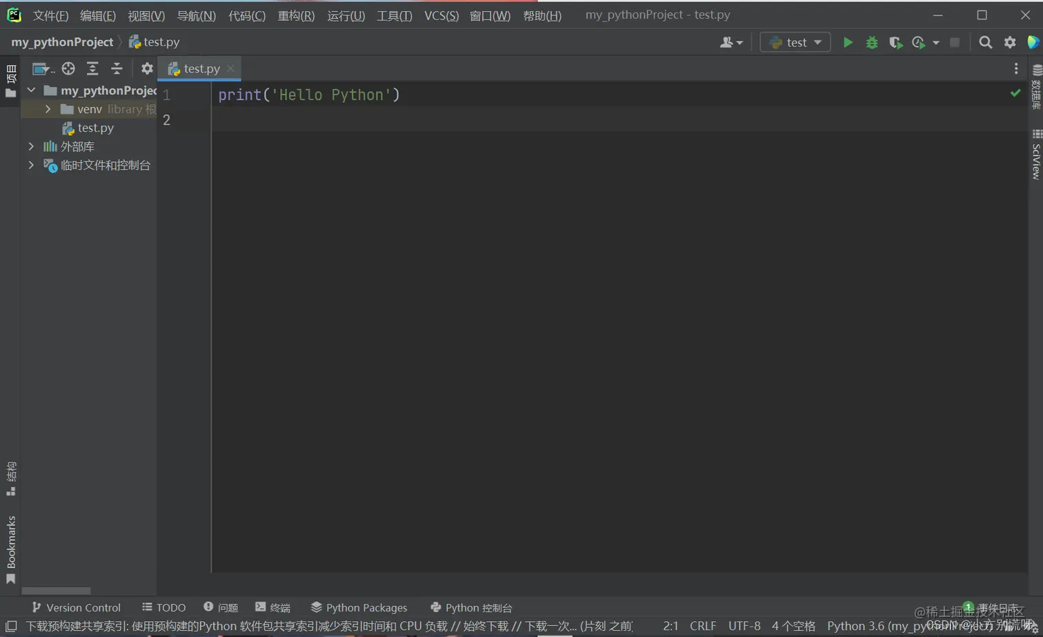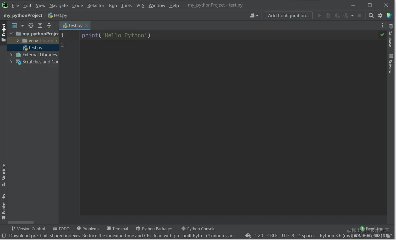 当看见控制台输入Hello Python,到这里PyCharm就安装好了。