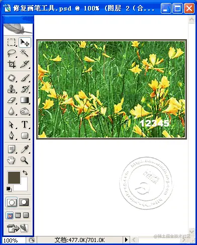 3、使用修复画笔工具去除文字。