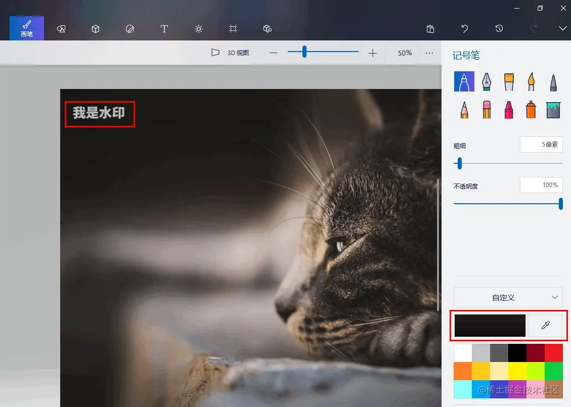 在画图3D中打开一张图片,点击【取色器】按钮提取水印周围的颜色,随后使用画笔工具将水印进行涂抹,就可以实现去除图片水印的效果了。