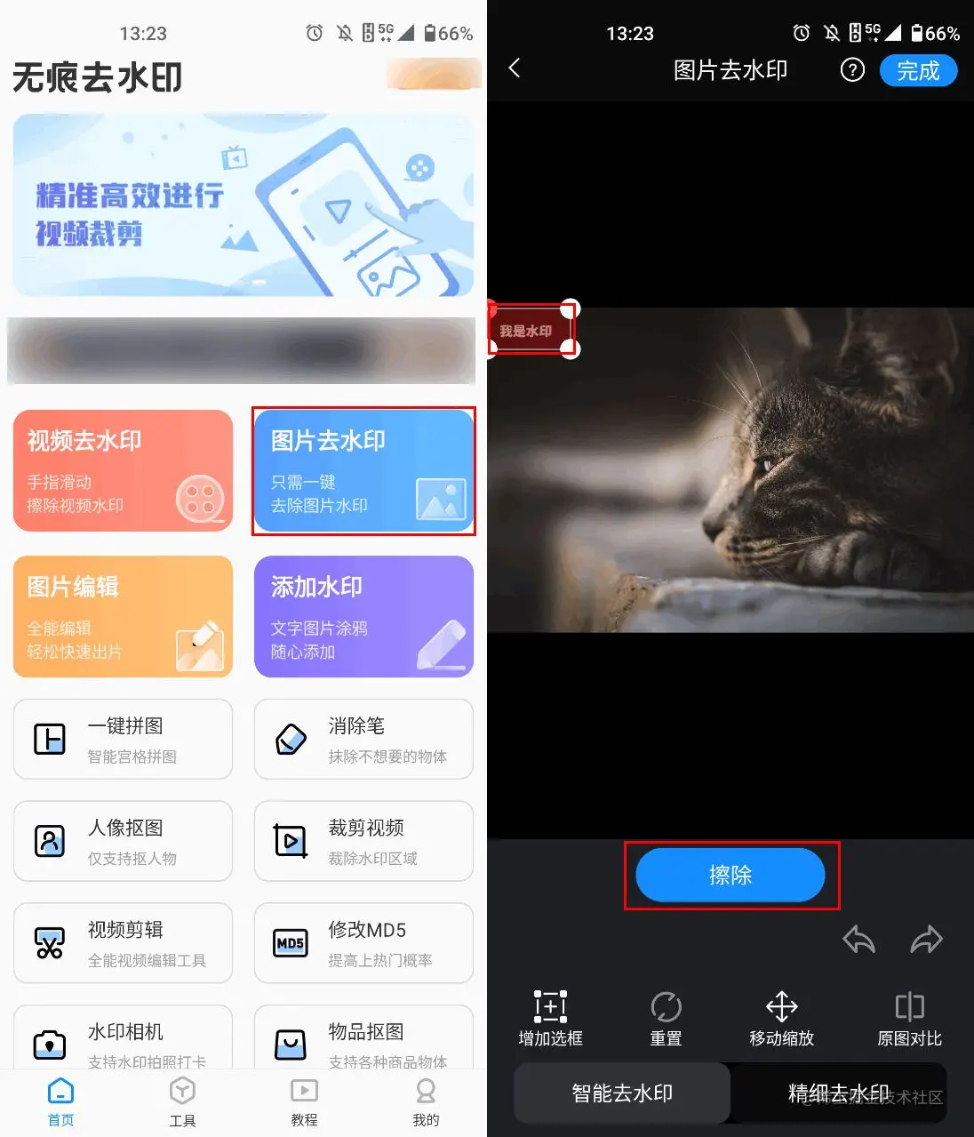 点击软件首页的【图片去水印】功能,选择需要去除水印的图片后,根据水印的数量来创建多个覆盖水印的选区,最后点击【擦除】按钮,就可以一键去除水印了。