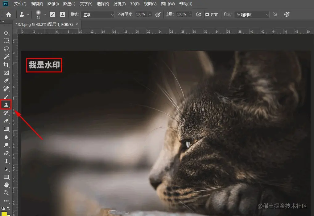 在PS中打开一张图片,随后点击左侧工具栏中的【仿制图章工具】,按住【ALT】键选择合适的画面,然后点击左键对水印进行覆盖就可以将水印去除了。