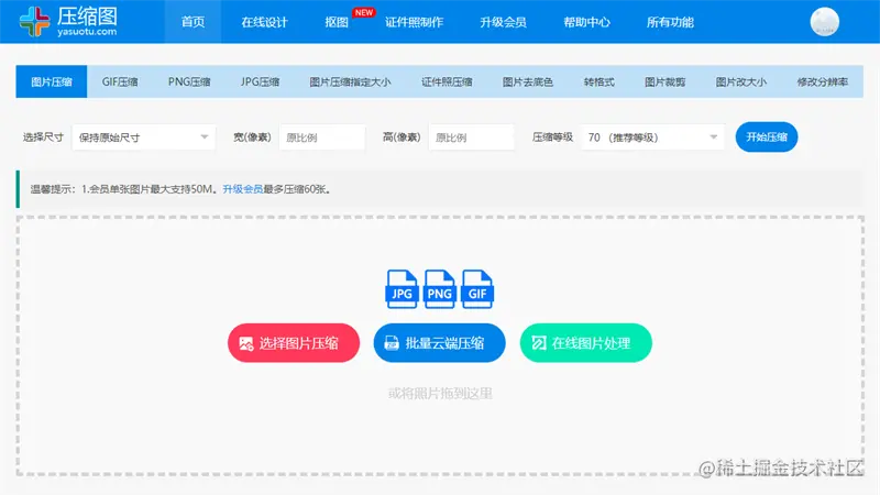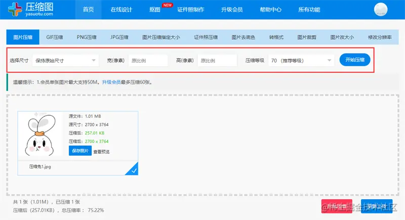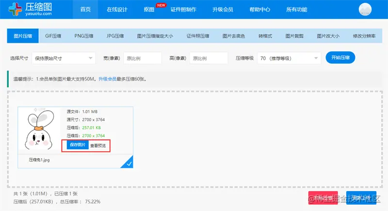 图片太大了怎么压缩?图片缩小kb怎么操作? 波多尔斯基 2023-05-10 280 阅读1分钟 怎么压缩图片大小呢?我们遇到图片太大的时候首先想到的是用压缩图片软件来将图片缩小kb,今天推荐大家一款在线压缩工具--压缩图,一起来看看怎么使用吧。 1、打开压缩图选择图片压缩 2、上传需要压缩的图片,设置好图片参数,默认压缩等级为70(压缩等级越小,压缩后越小;压缩等级越大,图片越清晰) 3、压缩完成后,点击保存就可以了 以上就是图片压缩的全部步骤了,方便又快捷,压缩图还支持证件照制作、图片去底色、转格式等多种图片处理功能。